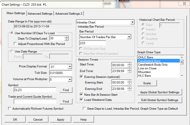 Attached is a sshot of 9 a.m. EST for CLZ3 - Notice the SC candle at 9 a.m. represents 233 ticks and is only 1 candle and the TOS 9 a.m. 233 tick candles represent multiply candles for the 9:00 a.m. Could I possibly have my setting wrong to represent 233 ticks per candle on the SC platform? I have attached a sshot of my setting. |