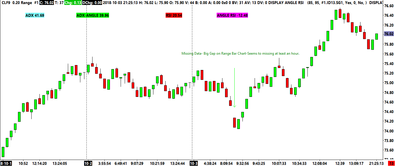 There appears to be some data missing on 10/3, it goes from 8:36 bar to 9:30 bar, and it gaps on a 20 range bar chart. Tried to reload and recalculate and delete data and download. Neither method seemed to fix problem.