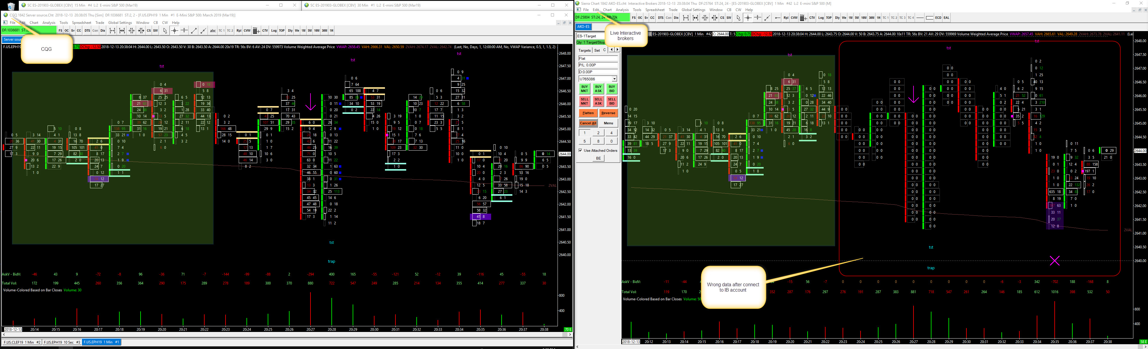 Ok thank you, I deleted this row: <realtime-data-client>default_primary</realtime-data-client> I'm desperate. My tradind has been paralyzed for more than a month. In my picture, there you see CQG and IB instances the same chart with the same timeframe. As you see, when IB is connected, then in some candles there are zeroes, then continues data which comes from IB, not from CQG. Please give me right instruction or help on remote asistent, otherwise I have to close sierra account and move to Ninjatrader. Sorry for that. |