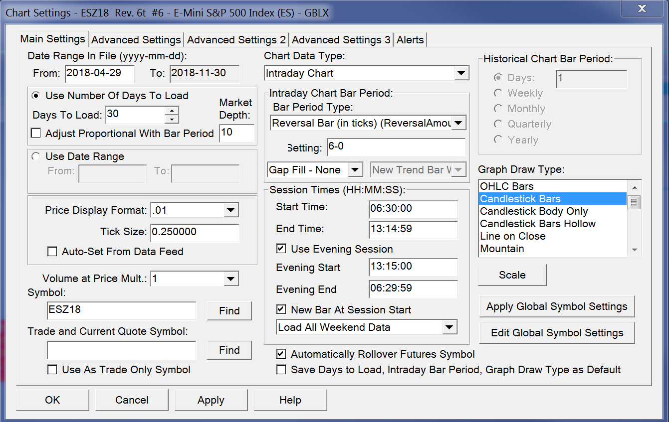 I'm new to Sierra Chart and I must not have my session times configured properly but can't figure out how to fix them. The ES opens on Sunday at 6:00pm EST and I don't get any data for it coming thru Sierra Chart on my charts or on a DOM. I know the market is open because I'm watching it trade on a different platform (different data feed). I'm subscribed to Sierra Chart historical and real-time data feed. A screenshot of my chart settings is attached. Can anyone give me some guidance on how to fix it? |