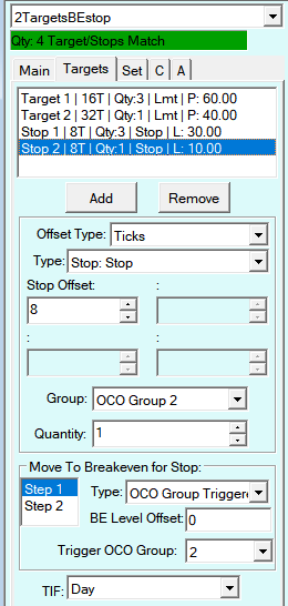 Hi guys! :D Im trying to follow up on kind of this question. Im trying to make stop-loss for OCO 1 and 2 move to breakeven when my first target is triggered. But i cant seem to make the SL move. Can you check out this picture and help me with my settings? :D Regards Sebbe EDIT! In case anyone needs and were as stupid as i were. I had put OCO group 2 on second stoploss. This should be OOC 1 since its when first target triggers (Target 1 = OCO grp 1) my stop should be moved. BTW! Sierra, you've done nothing but wonders. By far the best plattform out there in every way! Answers for everything. Customizable by max. Cheers guys Date Time Of Last Edit: 2024-06-11 20:30:28