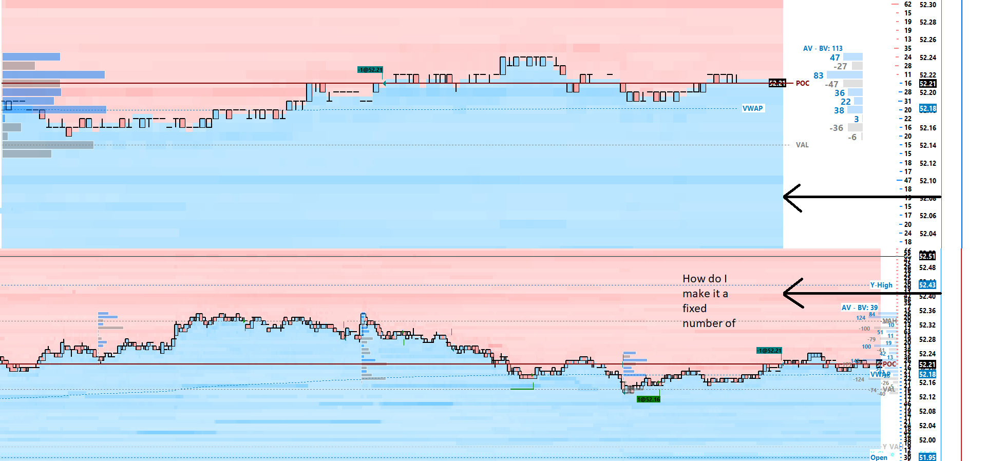 I'd like to lock the fill space so that when I change the number of bars shown on the chart the fill space stays a constant number of pixels away from the right edge. Right now, when I have a locked fill space, with like 50 bars, it looks completely different and overlaps the profiles on the right side of the chart making it hard to see anything when I change to 300 bars. Please see pictures.