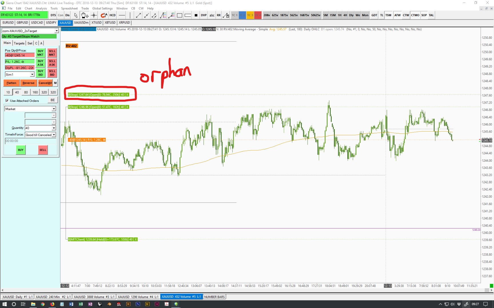 Hi support When scaling out of an open position which has OCO brackets consisting of a Stop Order and a "Market If Touched CLIENT" order the stop order is not being cancelled and is left as an open order. Settings to reproduce: Stop = Stop Target = MITClient Support Scale Out = True With 1 stop and 1 target and after the position is closed using BUY or SELL button: - Target is cancelled - good - Stop is left open - bad -> results in no position but an open order on the chart With 2 stops and 2 targets and after half the position is closed using BUY or SELL button: - 1x Target is cancelled - good - 1x Stop is left open - bad -> results in open position with 1x OCO and 1x orphaned stop order A screen shot is attached showing the reslut of closing half a position out manually with the BUY or SELL button. This problem behaviour is not seen when using server side Limit or Market If Touched orders for targets. Please confirm and indicate this can be fixed. |