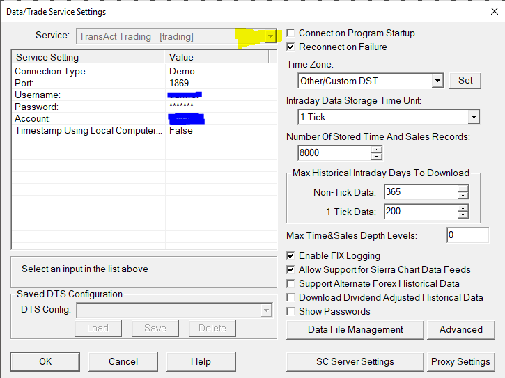 This is okay because the Sierra Chart Exchange Data Feed works when Sierra Chart is configured to work with Transact and other trading services. Just follow through the step-by-step instructions here: https://www.sierrachart.com/index.php?page=doc/SierraChartRealTimeFuturesStockDataFeed.php#SetupInstructions And refer to: https://www.sierrachart.com/index.php?page=doc/SierraChartRealTimeFuturesStockDataFeed.php#IntegrationWithTradingServices Sierra Chart Support - Engineering Level Your definitive source for support. Other responses are from users. Try to keep your questions brief and to the point. Be aware of support policy: https://www.sierrachart.com/index.php?l=PostingInformation.php#GeneralInformation For the most reliable, advanced, and zero cost futures order routing, *change* to the Teton service: Sierra Chart Teton Futures Order Routing Date Time Of Last Edit: 2018-12-14 18:27:08
