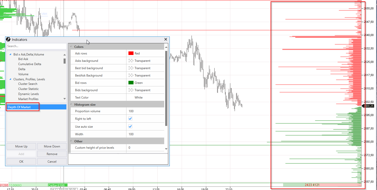 This is activated through the Trade menu: Trade Menu: Draw DOM Graph on Chart (Trade menu) Sierra Chart Support - Engineering Level Your definitive source for support. Other responses are from users. Try to keep your questions brief and to the point. Be aware of support policy: https://www.sierrachart.com/index.php?l=PostingInformation.php#GeneralInformation For the most reliable, advanced, and zero cost futures order routing, *change* to the Teton service: Sierra Chart Teton Futures Order Routing |