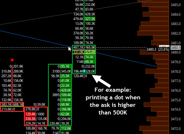 Hi guys, I need some help on this one: I would like to customize my number bar charts and I am looking to print a dot in bar at the level of the incoming volume, when a bid or ask is higher than a certain amount, for example 500 K - see the picture in attach, where I drawed what I want to accomplish. Its in fact a visual alert when big buying or selling comes in. . Ik know that it is possible but I can't figure out how to do this. So thanks for giving this a look |