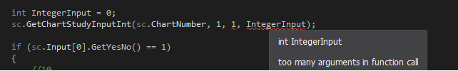 hi i would like to ask why i am getting this error when using the function sc.GetChartStudyInputInt(). i just copy and paste the code from the example provided in your documentation here ACSIL Interface Members - Functions: sc.GetChartStudyInputInt() and it doens´t work since there are too many arguments.. do u have any idea why is it so? |