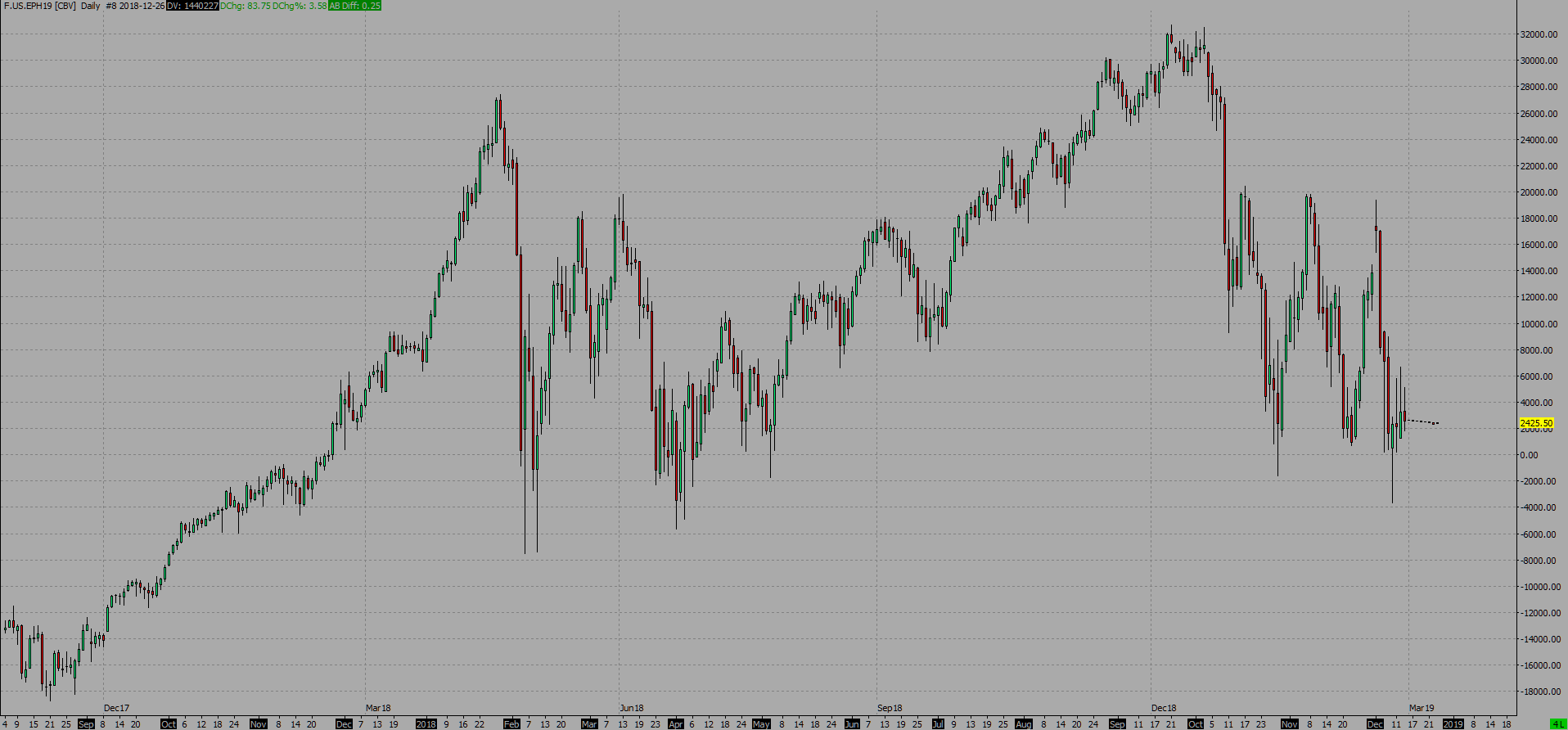 Attached daily historical chart shows significantly incorrect prices/price scale. Interestingly the price for the current contract since rollover looks to be right (ie for the last 8 days). But this continuous chart is showing price values ranging from +32,000 to -18,000. I have tried deleting all historical data and reloading, deleting the relevant files from the Data sub folder and re-setting the Global Symbol settings. None of them make any difference. The ES current price on the March contract is 2427.50. [v1853, CQG data] Thanks EDIT: it is happening on all symbols from CME via CQG that I track. Have CQG done something about the price multiplier or is my historical data coming from SC/Barchart and something re the price multiplier has changed there causing an mis match between historical prices and intra day data? Date Time Of Last Edit: 2018-12-26 20:58:18