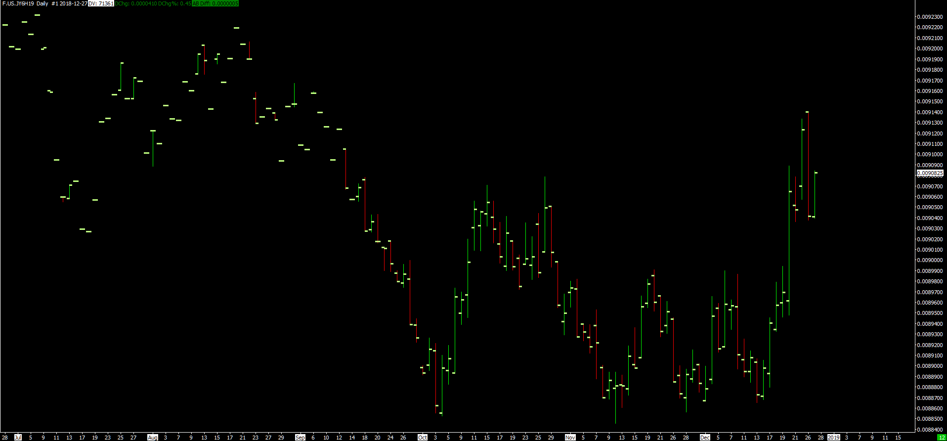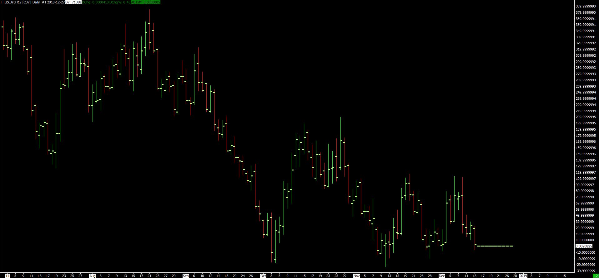 In simple terms that makes no difference. I think the issue is to do with decimal places in the historical data versus the real time intra day data. So the historical chart for CQG symbol for Yen for current March 19 contract (NON continuous contract) shows correct data. (chart attached) Turn same chart into a continuous contract (volume back adjusted) and the data mis matches. ie the big problem. (chart attached) I have also attached the chart of the historical data just for the current Yen contract - this seems to suggest the data is out by several decimal places ie 9080.000 should be .009080. When I attempt to delete all this data and reload it for this chart I get a yellow banner message saying 'Symbol Settings not found for current service'. I have then saved a screen grab (not attached) of all the contracts making up the continuous contract (you see this when deleting and downloading data). I can see the historical data is made up of symbol J6***. Yet in Global Symbol settings it says there is no such contract. I am stuck. I don't follow every futures contract, but it is happening for the 6J (Yen), 6E (Euro), CL (Oil) and ES (S&P). But it is NOT happening with YM (Dow) or NQ (Nasdaq). This is even though the chart set ups are identical. |