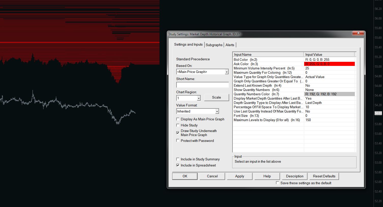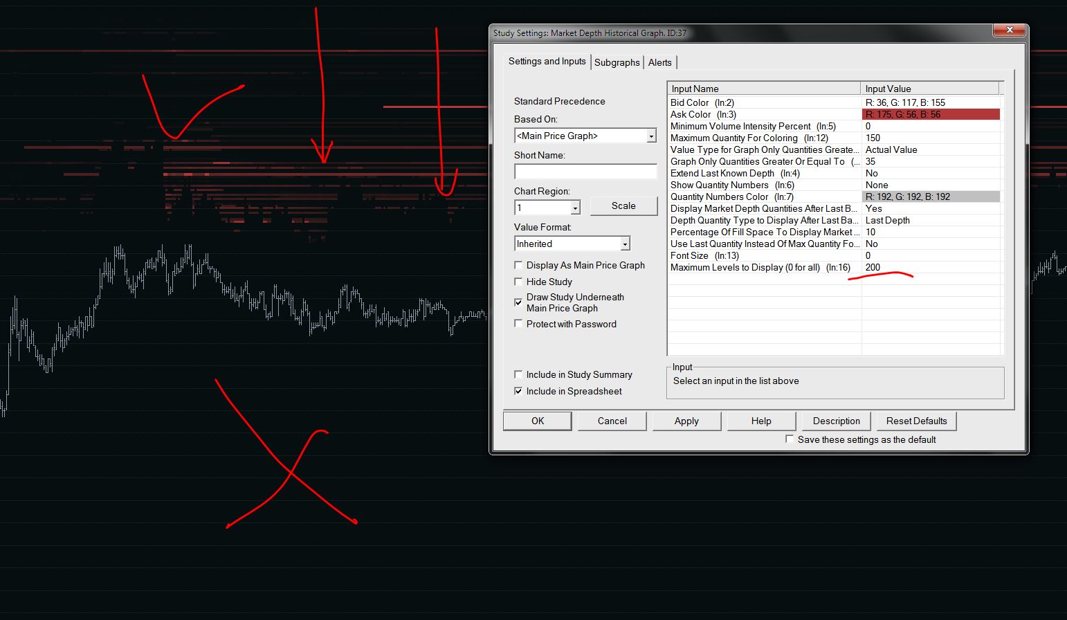 My chart settings are standard for crude. No modifications there. Also settings for depth study colors are not a problem here (i set both to 0 as you asked). Here you have some screens with different levels setting. No real logic there. Also im not sure about your number of levels exlpanation. If I set it to 200 I expect to have 100 bids and 100 offers starting from current price. Of course it doesnt mean that it will show all 100 prices up and down as depth at some prices can be zero so it should iterate all 100 available levels from price up/down. It should be excatly same logic as in sc.GetAskMarketDepthEntryAtLevel() and sc.GetBidMarketDepthEntryAtLevel() and where I can call sc.GetAskMarketDepthNumberOfLevels() function to look for actual depth levels available here you should just set this as constant value (study input) and just iterate up and down from price. |