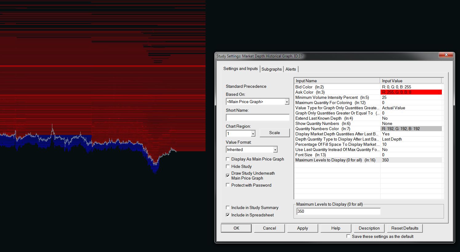 Market Depth Historical Graph creates very big CPU load when showing all depth levels (500/500 levels from price) even though 80% of levels could be not visible at current scale of the chart (when chart is zoomed in). Could you add an input to narrow down depth levels shown by this study, same as in Bid/Ask Depthbars study (with Historical data option selected)? Thanks |