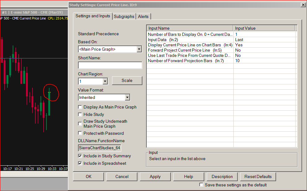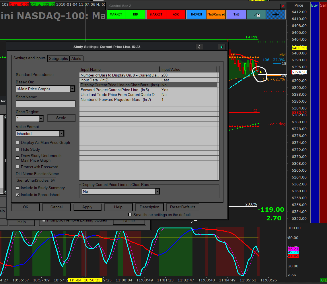 The best I could do was get it to display one bar forward of the current price (See Attachment), not ON the actual candle or bar. I thought that turning Number of Bars to Display to 0 should do that but that didn't work when I tried. Maybe SC Support will chime in. -- Scott Date Time Of Last Edit: 2019-01-04 16:10:41