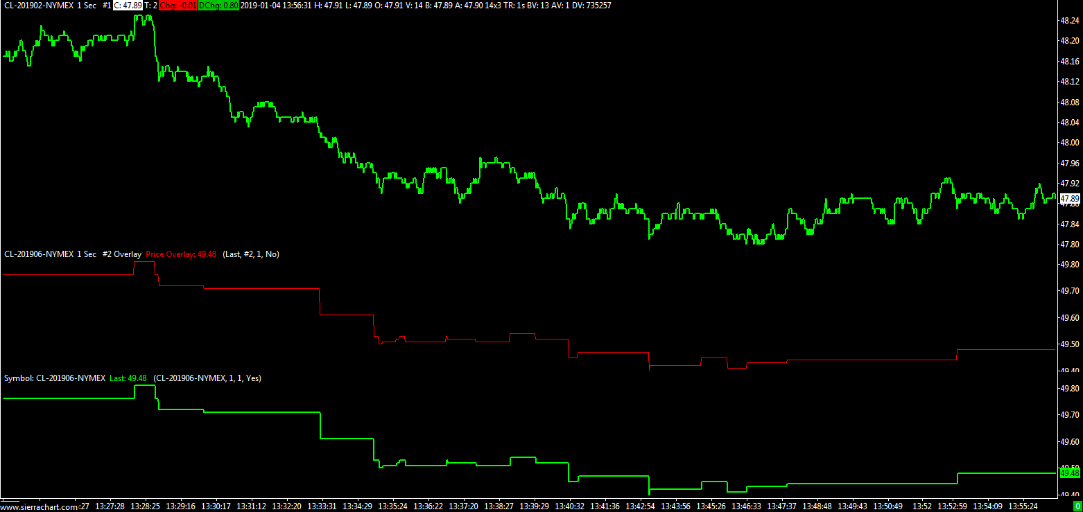 I have been testing the Overlay and Add Additional Symbol studies to charts to use for eventual spread trading. However, I have noticed when comparing these two studies to the original symbol, they plot completely differently. If you view the two attached charts, one chart is CL 6/19 by itself. The other chart is CL 6/19 charted in chart regions 2 and 3 underneath the main price graph. If you compare the original CL 6/19 chart to the Overlay and Additional symbol studies, you will see they look completely different. They are both the same symbol and time frame, but they appear to be two different sets of data. http://www.sierrachart.com/image.php?Image=1546628192382.png http://www.sierrachart.com/image.php?Image=1546628289659.png If I change the main symbol on the chart in region 1 from CL 2/19 to CL 6/19, then the Overlay and Add Additional Symbol studies will chart correctly and match the original chart. So I have no idea what's going on or why this is happening. Your help is greatly appreciated. Thanks. |