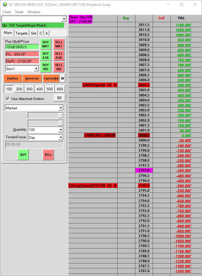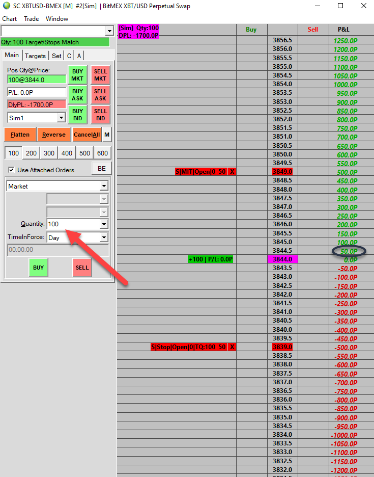 Hello, Regarding the XBTUSD perpetual swap, since 1 contract of XBTUSD = $1.00, a quantity of 100 on the trading DOM (see attached pic) should be equivalent to $100, yes? If this is correct, why then does the P&L column show a $50 increase only one tick higher than the entry price @ 3844? Also there is zero leverage being utilized with this simulated trade. Thanks, ZS Date Time Of Last Edit: 2019-01-05 05:58:51