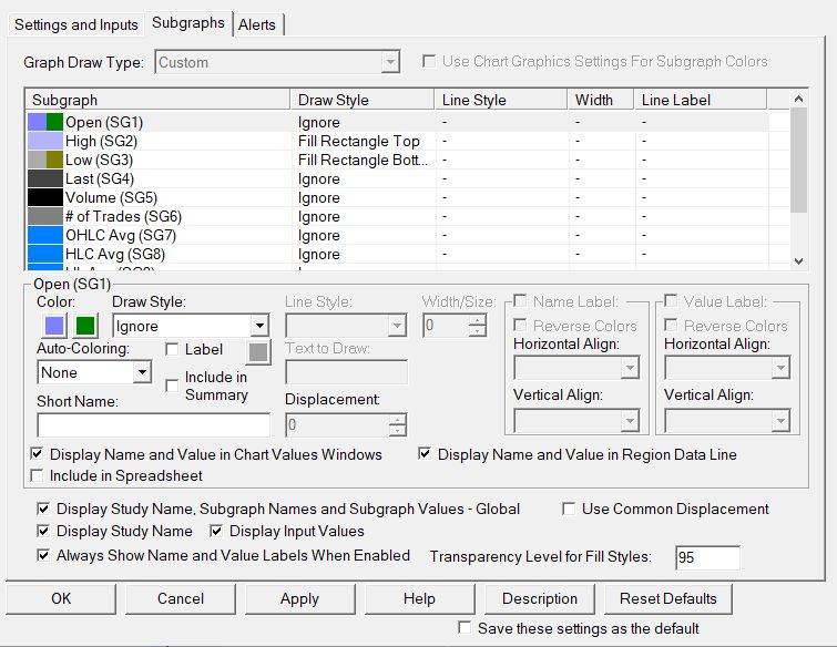 Hi there, I'm trying to overlay SPY 5min chart to its 2000tick chart, and I couldn't figure out how to get exactly what I want. So i use study/price overlay study, and use the containing match and multi-column rectangle selection, but I can't seem to change the study/price overlay subgraph settings. Every time I change something from the default setting and click apply, it just goes back to the default setting. Right now the rectangle shows the 5min high and low, and I'd like to rectangle section to be the 5min candle open and close, with wicks for high and low. Could you please advise how to achieve that? Thanks!