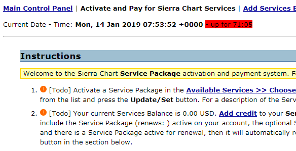 In regards to post #7 and #8, you have two different Sierra Chart accounts and you made a payment on your other Sierra Chart account compared to the account you are currently looking at. Notice the description on the PayPal receipt. It has your Sierra Chart username there. We think your other postings are related to this same issue. You should be using the Sierra Chart account that has the 15 USD credit. Sierra Chart Support - Engineering Level Your definitive source for support. Other responses are from users. Try to keep your questions brief and to the point. Be aware of support policy: https://www.sierrachart.com/index.php?l=PostingInformation.php#GeneralInformation For the most reliable, advanced, and zero cost futures order routing, *change* to the Teton service: Sierra Chart Teton Futures Order Routing |