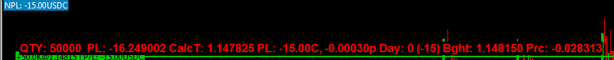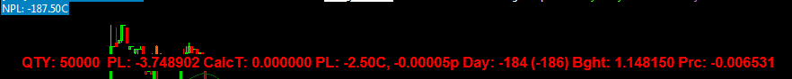 All, Firstly I assume that everybody working with ACSIL does not need an explanation about how to show the P&L of a Chart/Study on-screen. Or maybe this is to keep you guys objective. Now : Suppose a symbol like EUR.USD. See attached Sierra14 for the settings. When I use the normal properties for it, the granularity is 2.50 euro. This can't be normal ... Or IOW, what can I be doing wrong or what can be wrong in general. I searched the life out of me for formatting/rounding options, but I don't see anything about it (I actually hope I missed it). Also, what's seen in the Sierra14 attachment is correct IMO but anyway setting that to smaller numbers does not change a thing (and shouldn't, I'd say). I tried to improve on this myself, and in the Sierra14a and Sierra14b attachments you see this happening. What I do here is calculating the pip distance to a percentage and from there calculate the better granular P&L (you can kind of see the base data for this in the a and b attachments). Notice that the 2nd "PL:" number is what SC would report herself to the interface, which is the same as the red or green trade bar shows and which is what accumulates in the NPL number in the top of the screen. The first "NPL:" number comprises my own calculation. What can I have set wrongly so the P&L rounds to 2,50 euros ? Thanks for any insight ! Peter |