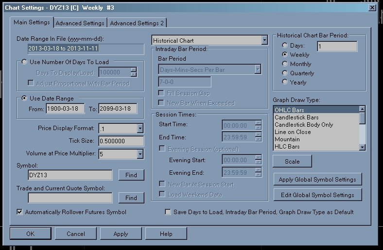 More Continuous Contract issues: I need longterm Continuous charts (not backadjusted). Why does Sierra cut-off the Conti charts in 2010 ? I have Daily data to 1990. Please explain or extend the history. I am aware of this workaround: http://www.sierrachart.com/index.php?l=doc/helpdetails51.html#HistoricalCharts This workaround is complicated - why not simply give more history ? My settings: http://www.sierrachart.com/image.php?l=1384168137426.png |