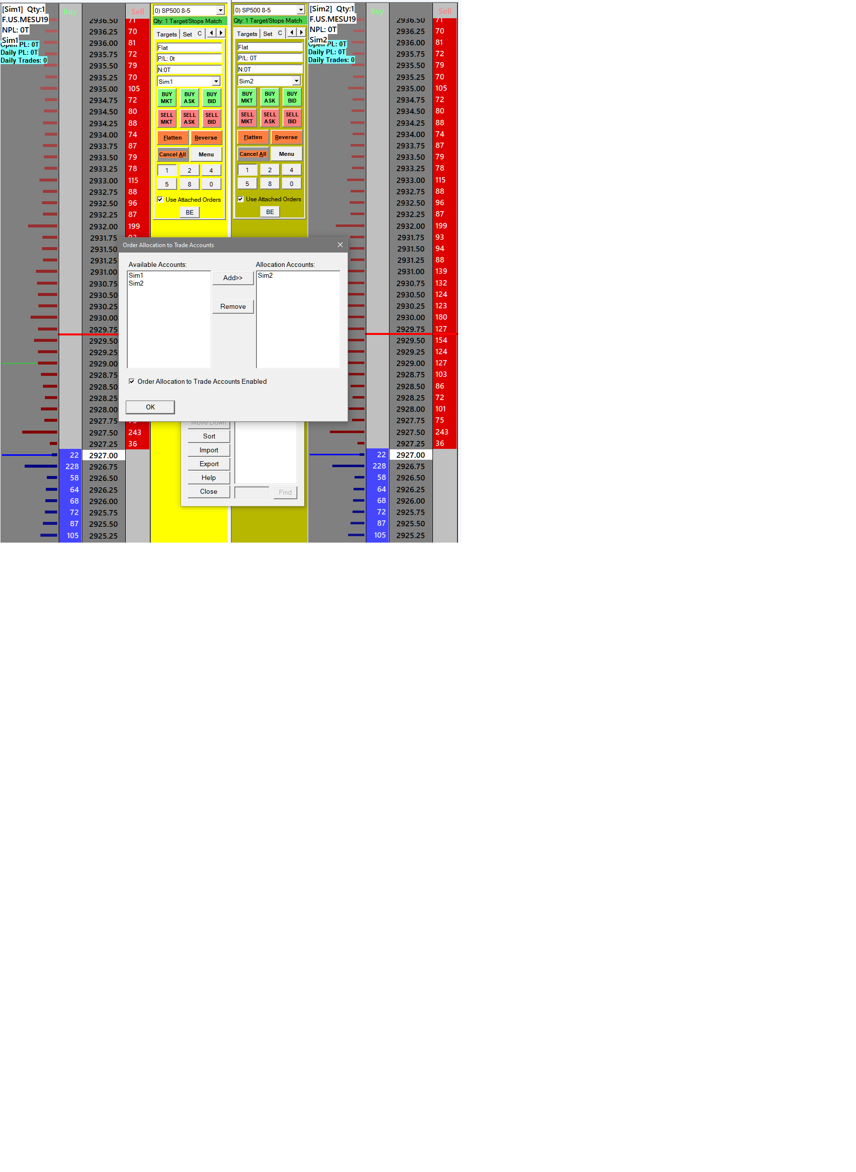 Broker: AMP Routed thru: CQG Trading on DOM ladder. USE ATTACHED ORDER is checked. See attached photo. I have setup according to instructions but the orders are not copying. My understanding is that orders should copy on the DOM ladder for the second as well. Is that correct? UPDATE: The order allocation seems to work as designed when NOT using attached orders. When attached orders ARE used, this is the outcome FYI: I placed an attached order for a BUY LMT with a Target and Stoploss on SIM1 and allowed it to fill. SIM2 DOM never showed the working orders on the ladder nor did it fill anything (as expected). However, when I flattened on SIM1 DOM, the SIM1 position flattened, but then SIM2 filled an individual sell order. So it seems any individual orders are copied but any attached orders are not copied. FYI for others. Date Time Of Last Edit: 2019-08-21 17:33:50