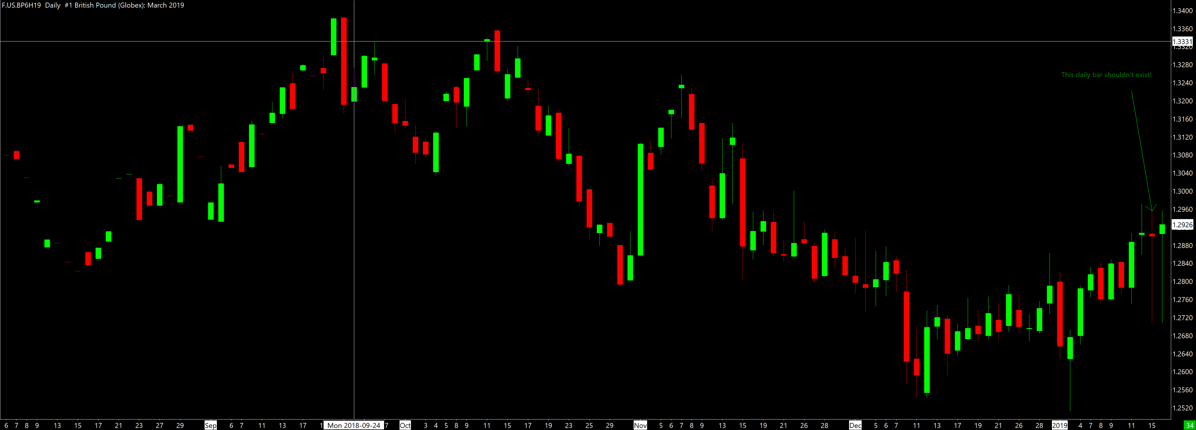 I'm using CQG Data with sierra chart 1861 (also tried it with 1859). When I load the Daily Historical Chart, the chart displays an extra, faulty daily bar right before the current daily bar. I've attached a screenshot of 6B (british pound) futures historical daily chart which should make what I'm saying more clear. http://www.sierrachart.com/image.php?Image=154758574722.png |