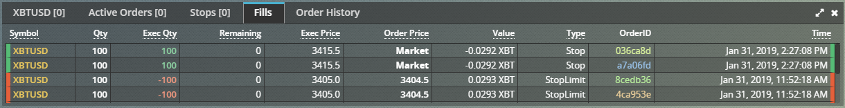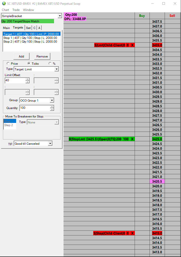 I executed a simple bracket OCO order via the DOM with a stop-limit for entry, a limit order for profit target, and two stops for stop-loss. The objective is to take half off the position once I reach the profit target so that I will break even if price then moves against me. Once the order filled, I went to go run some errands, and kept my computer running along with sierra chart. When I returned, I saw that my stops had been triggered, and my position had been closed. However my limit order was still active, even though my stops had been hit. I'm including pictures of the DOM showing what my trade/attached orders look like as well as my fills directly from BitMEX. ZS Date Time Of Last Edit: 2019-01-31 23:23:56
