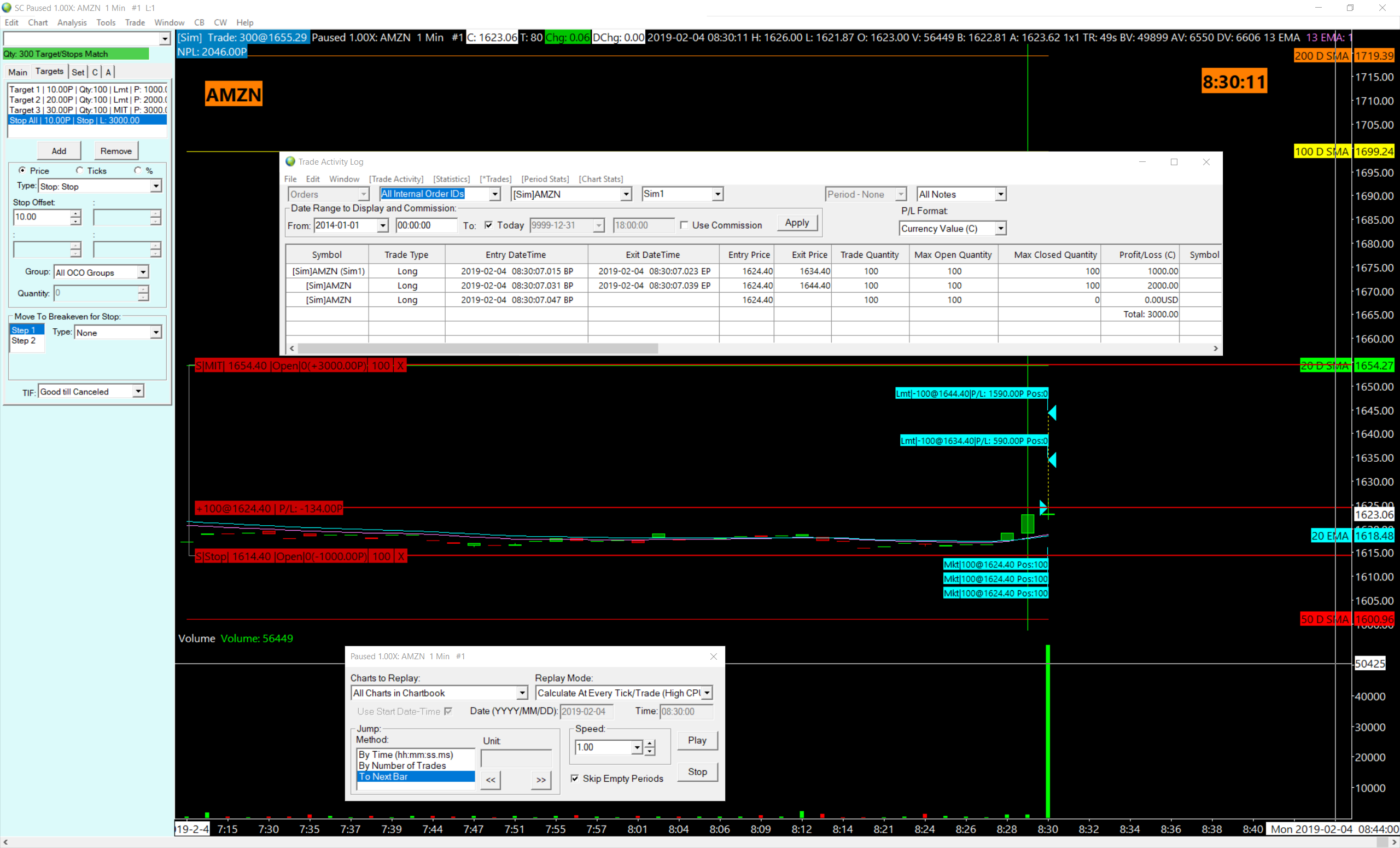 I'm trying to use attached Target:Limit orders during a replay. However, when the parent order fills, the Target:Limit orders also automatically fill even though price never reached the targets. If I change the target type from Target:Limit to Target:Market if Touched, then the replay works correctly and the targets are only filled once price touches the respective target. Is there a switch or something that I need to throw for Target:Limit to work on a replay? I've read through the following pages and cannot find anything that explains this behaviour: Replaying Charts Attached Orders I've attached a screenshot showing the issue where the Targets were set as follows: Target 1 10.00P | Qty 100 | Lmt Target 2 20.00P | Qty 100 | Lmt Target 3 30.00P | Qty 100 | MIT Stop All | 10.00P | Stop | L I then pushed Buy at the open today on AMZN and 300 shares were filled at 1624.40. The first 2 Target:Limits were immediately filled and SC is showing a profit of $3000 even though price had not yet traded above 1627 (no where near the targets). The 3rd Target:MIT is correctly showing as Open @ 1654.54 |