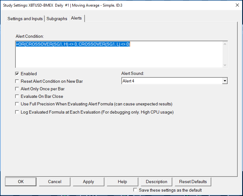 One, can you have multiple alert conditions for one study? Study/Chart Alerts And Scanning: OR and AND Functions Second, regarding the first alert formula example (Alert When Moving Average Within Range of Price Bar) what precisely does "range" mean in terms of distance from the moving average? The range is the high to low price range and it is exact. The documentation has been updated for this.