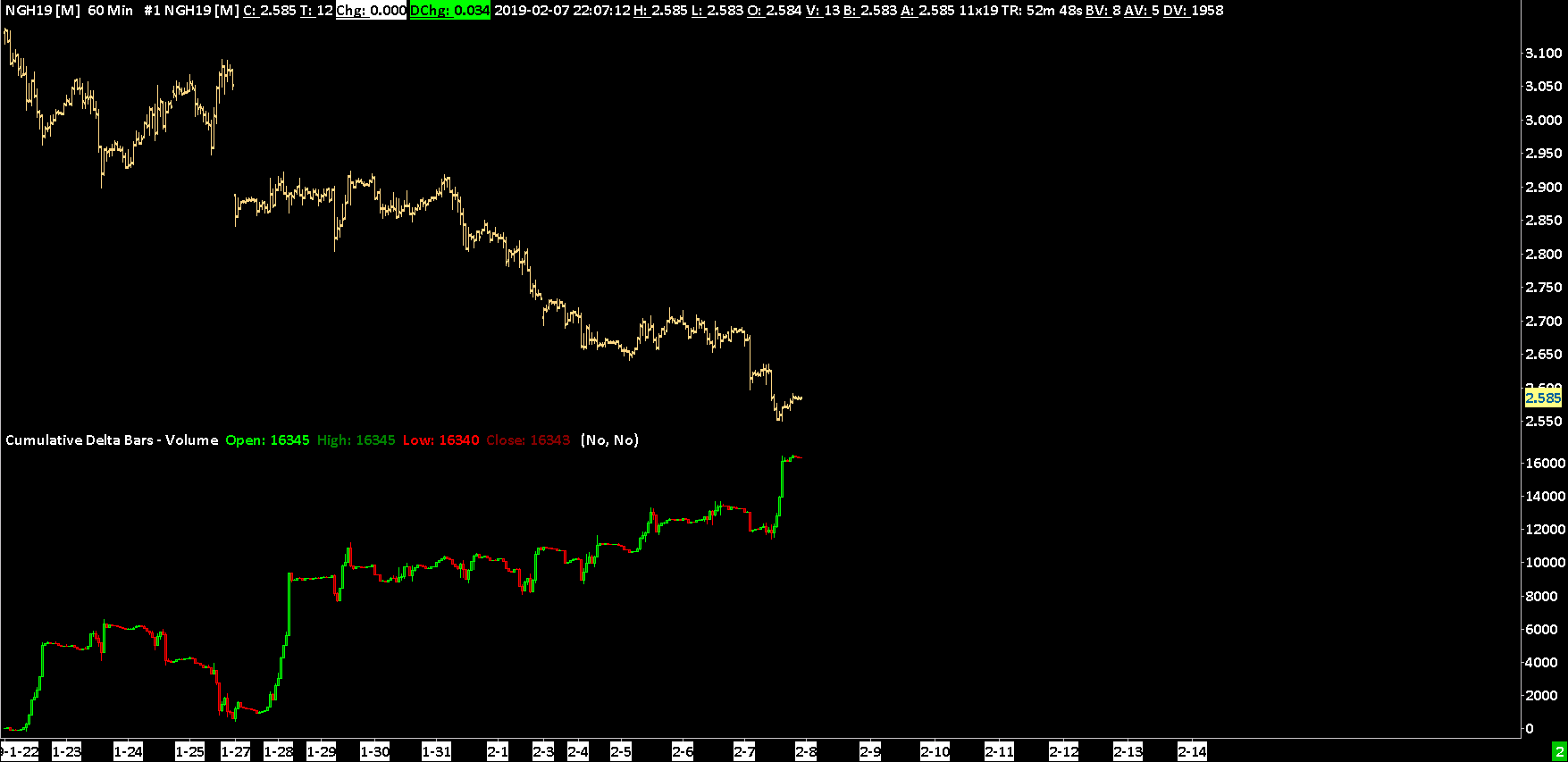 Good day, Sierra Chart Team, hope you all are doing great, *imgur.com/a/45l8NKg* As the image attached shows, this is a Natural Gas Futures chart for about two months, from the last week of 2018-12, till today, 2019-02, with a cumulative delta volume bar added, no data re-roll from each session, it was turn off by me in order to showcase a more clear path of buying and selling; what I want to say about this is, am I crazy seeing what the delta volume study is showing me? Am I out of my mind that all I can see is a huge amount of buying cumulated again while the price of gas is down at the moment? Why is all of this large amount of buying not pushing the price of gas up? Is this the proof of big money doing the same old trick again the same as what they have done at the beginning of 2019-01? While the price of gas was down at 2019-01, huge buying occurred as the delta chart showed, and after that, we all know what happened, the price of gas spiked to 3.7 from 3.0, the old classic price pumping trick, I really want to know whether not am I crazy on this, but all I can see is big money cumulating their position again at the dip of gas price, and they are planned to do the same from a few days to a few weeks later. I'm a little bit paranoid and scared on this case, even questioning Sierra Chart's data feed and delta study, are they valid and corrected? The buying/selling delta chart should roughly match the movement of price in the normal case, but the price of gas is not going up while someone is buying gas in bulk, quietly, this is rather strange to me. I just want to share this case with you, maybe having a conversation on this. I'm curious about what Sierra Chart Team would say about this. Thank you for your time, hope to talk to you soon.  |