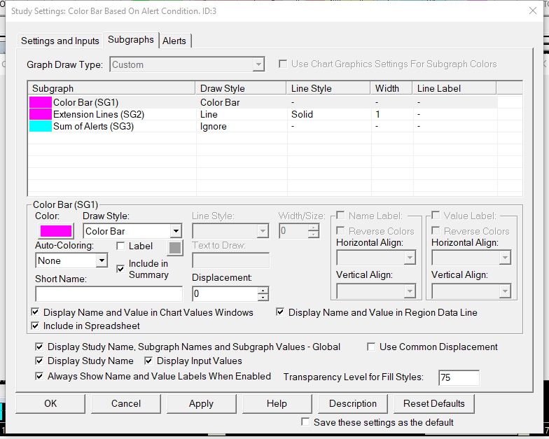 You can use the Color Bar Based on Alert Condition study: Color Bar Based on Alert Condition Sierra Chart Support - Engineering Level Your definitive source for support. Other responses are from users. Try to keep your questions brief and to the point. Be aware of support policy: https://www.sierrachart.com/index.php?l=PostingInformation.php#GeneralInformation For the most reliable, advanced, and zero cost futures order routing, *change* to the Teton service: Sierra Chart Teton Futures Order Routing |