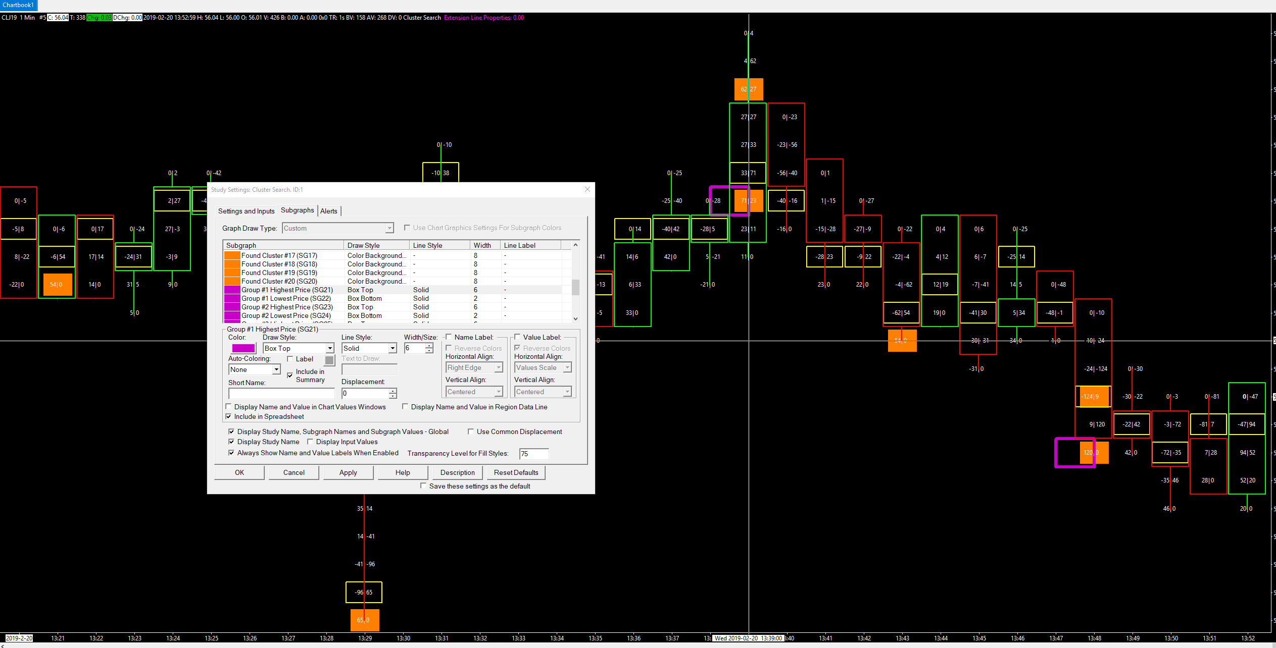 Hello! My ACSIL study found some clusters using Volume At Price data. As cluster has founded juct the price recorded to some subgraph. After that I have to highlight this price on Numbers Bars study. 1). For color background I use DRAWSTYLE_COLOR_BACKGROUND_AT_PRICE (orange color on screenshot). But width of this draw style is smaller then width of candle - some black fields on the left and on the right sides. How can I fill all backround for the price? 2). And I need second highlight like a POC Highlight at Number Bars study - just box (yellow color on screenshot). I am trying to use BoxTop and BoxBottom but the Box is not at center of the candle, it is moved to the left on previos candle(pink color on screenshot) How can I setting draw style exactly the same that Numbers Bars study uses for the POC price? Please find screenshot attached. Thanks in advance. |
