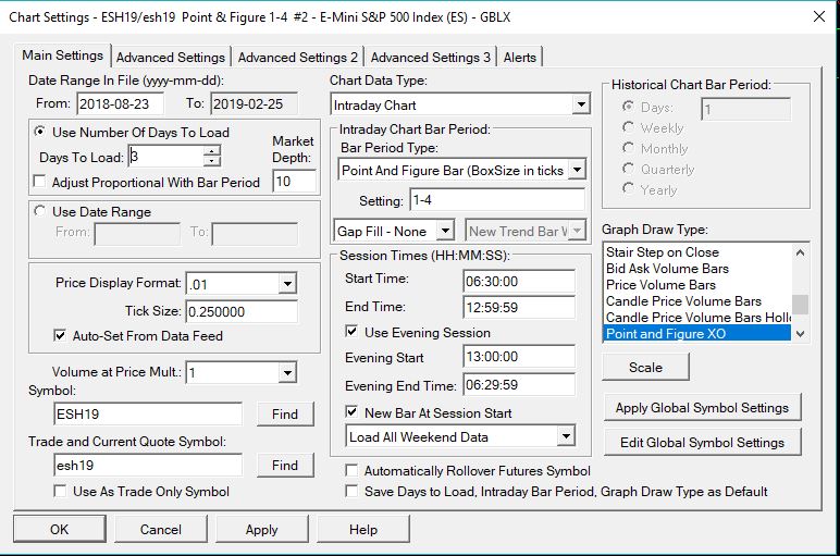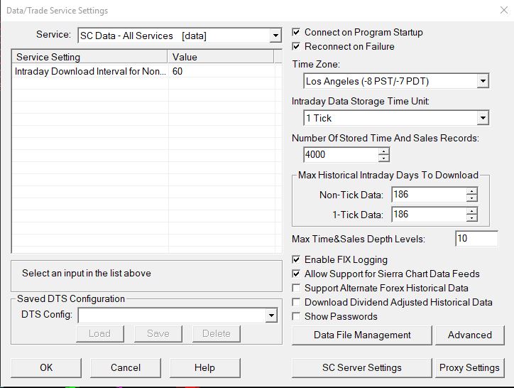 Successfully loaded SC for first time yesterday (Sunday evening) on trail and am using all SC data feeds. I have loaded a Pnf chart and it lags real time by about half an hour. Last bar now is 9:16 AM and real time is 9:48 AM. I think I'm connected - "Con" in tool bar is grey. I seem to have data up till 9:16 and I opened the SC an hour earlier. I have reviewed my settings several times in Chart>>Chart Settings, and Global Settings>> Data/Trade Service settings. See screen shots. The DOM is stagnant and Candlestick graph also seems stagnant. I have paddled around the documentation for some time and making no progress with this issue. Any suggestions? |