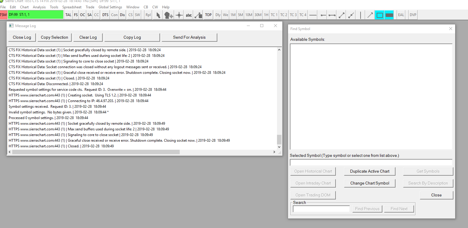 You will now be able to get the symbols. Go to File >> Find Symbol and open a chart through that window and make sure you are using the correct symbol. If you have any market data authorization issue, contact Top Step Trader for further help. But really they should have put you on Rithmic because users have had problems with the CTS simulation server recently. And just for the record we have our own Trade Simulation service: Simulated Futures Trading Service Sierra Chart Support - Engineering Level Your definitive source for support. Other responses are from users. Try to keep your questions brief and to the point. Be aware of support policy: https://www.sierrachart.com/index.php?l=PostingInformation.php#GeneralInformation For the most reliable, advanced, and zero cost futures order routing, *change* to the Teton service: Sierra Chart Teton Futures Order Routing Date Time Of Last Edit: 2019-02-28 20:46:47