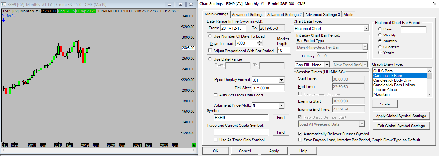 I had previously completed all the advised actions in your response "prior" to posing my help request, however, as instructed I did complete the above instructions with no additional historic data resulting in my ES charts (populated data from December 2015 to present). A. Historical Charts Settings are populated with the following: 1/Chart Settings/Main Settings/Chart Type/Historical Chart 2/Chart Settings/Main Settings/Use Number of Days to Load/Day to Load: 7000 (less than the 20Y acc. maximum) 3/Chart Settings/Main Settings/Apply Global Symbol Settings B. Screenshot of chart and chart settings attached. C. The resulting Message Log is attached below. **Message Log** Software version: 1880 32-bit | 2019-03-03 16:43:47 Enabled for: Advanced Features. | 2019-03-03 16:43:47 Enabled for: Advanced Features 2. | 2019-03-03 16:43:47 Enabled for: Sierra Chart Historical Data Service. | 2019-03-03 16:43:47 Allow Support for Sierra Chart Data Feeds is enabled. | 2019-03-03 16:43:47 Current selected Data/Trading service: TransAct Trading | 2019-03-03 16:43:47 Chart Update Interval: 500 | 2019-03-03 16:43:47 Intraday Data Storage Time Unit: 1 | 2019-03-03 16:43:47 Service username command line set: sm*** | 2019-03-03 16:43:47 Time Zone: -05:00:00 (EST-05EDT+01,M3.2.0/02:00,M11.1.0/02:00) | 2019-03-03 16:43:47 2019-03-03 16:43:47 Local computer time | 2019-03-03 16:43:47 2019-03-03 21:43:47 Local computer time in UTC | 2019-03-03 16:43:47 2019-03-03 16:43:47 Local computer time in SC Time Zone | 2019-03-03 16:43:47 2019-03-03 19:24:23 Server time in UTC | 2019-03-03 16:43:47 Local computer UTC time and Server UTC time difference: 1 seconds. | 2019-03-03 16:43:47 Program path: C:\SierraChart\SierraChartTransActMA\ | 2019-03-03 16:43:47 Data Files path: C:\SierraChart\SierraChartTransActMA\Data\ | 2019-03-03 16:43:47 OS Version Number: 10.0 | 2019-03-03 16:43:47 Locale Setting: C | 2019-03-03 16:43:47 DLLs: StrategyAlerts.dll, StrategyAlerts_64.dll, UserContributedStudies.dll, UserContributedStudies_64.dll, VCValueLevels.dll | 2019-03-03 16:43:47 Requested symbol settings for service code transact.trading. Request ID: 1. Overwrite = on. | 2019-03-03 16:44:16 HTTPS connection ID:1 to www.sierrachart.com:443 for request ID:1 (2) | Creating socket. Using TLS 1.2. | 2019-03-03 16:44:16 HTTPS connection ID:1 to www.sierrachart.com:443 for request ID:1 (2) | Connecting to IP: 46.4.97.203. | 2019-03-03 16:44:16 Symbol settings received. Request ID: 1. | 2019-03-03 16:44:17 Processed 808 symbol settings. | 2019-03-03 16:44:17 Reconnect to the data feed after processing symbol settings. Use 'File >> Disconnect' and 'File >> Connect to Data Feed'. | 2019-03-03 16:44:17 HTTPS connection ID:1 to www.sierrachart.com:443 for request ID:1 (2) | Shutdown started. Waiting for graceful close. | 2019-03-03 16:44:17 HTTPS connection ID:1 to www.sierrachart.com:443 for request ID:1 (2) | Socket gracefully closed by remote side. | 2019-03-03 16:44:17 HTTPS connection ID:1 to www.sierrachart.com:443 for request ID:1 (2) | Closed. | 2019-03-03 16:44:17 ESH9 [CV] Monthly #1 | Reloading chart. | 2019-03-03 16:44:38 Unable to determine transition date based on volume from files: ESH00.dly, ESM00.dly | 2019-03-03 16:44:39 The ESM00.dly symbol may not be the active contract month. | 2019-03-03 16:44:39 Unable to determine transition date based on volume from files: ESM00.dly, ESU00.dly | 2019-03-03 16:44:39 The ESU00.dly symbol may not be the active contract month. | 2019-03-03 16:44:39 Unable to determine transition date based on volume from files: ESU00.dly, ESZ00.dly | 2019-03-03 16:44:39 The ESZ00.dly symbol may not be the active contract month. | 2019-03-03 16:44:39 Unable to determine transition date based on volume from files: ESZ00.dly, ESH01.dly | 2019-03-03 16:44:39 The ESH01.dly symbol may not be the active contract month. | 2019-03-03 16:44:39 Unable to determine transition date based on volume from files: ESH01.dly, ESM01.dly | 2019-03-03 16:44:39 The ESM01.dly symbol may not be the active contract month. | 2019-03-03 16:44:39 Unable to determine transition date based on volume from files: ESM01.dly, ESU01.dly | 2019-03-03 16:44:39 The ESU01.dly symbol may not be the active contract month. | 2019-03-03 16:44:39 Unable to determine transition date based on volume from files: ESU01.dly, ESZ01.dly | 2019-03-03 16:44:39 The ESZ01.dly symbol may not be the active contract month. | 2019-03-03 16:44:39 Unable to determine transition date based on volume from files: ESZ01.dly, ESH02.dly | 2019-03-03 16:44:39 The ESH02.dly symbol may not be the active contract month. | 2019-03-03 16:44:39 Unable to determine transition date based on volume from files: ESH02.dly, ESM02.dly | 2019-03-03 16:44:39 The ESM02.dly symbol may not be the active contract month. | 2019-03-03 16:44:39 Unable to determine transition date based on volume from files: ESM02.dly, ESU02.dly | 2019-03-03 16:44:39 The ESU02.dly symbol may not be the active contract month. | 2019-03-03 16:44:39 Unable to determine transition date based on volume from files: ESU02.dly, ESZ02.dly | 2019-03-03 16:44:39 The ESZ02.dly symbol may not be the active contract month. | 2019-03-03 16:44:39 Unable to determine transition date based on volume from files: ESZ02.dly, ESH03.dly | 2019-03-03 16:44:39 The ESH03.dly symbol may not be the active contract month. | 2019-03-03 16:44:39 Unable to determine transition date based on volume from files: ESH03.dly, ESM03.dly | 2019-03-03 16:44:39 The ESM03.dly symbol may not be the active contract month. | 2019-03-03 16:44:39 Unable to determine transition date based on volume from files: ESM03.dly, ESU03.dly | 2019-03-03 16:44:39 The ESU03.dly symbol may not be the active contract month. | 2019-03-03 16:44:39 Unable to determine transition date based on volume from files: ESU03.dly, ESZ03.dly | 2019-03-03 16:44:39 The ESZ03.dly symbol may not be the active contract month. | 2019-03-03 16:44:39 Unable to determine transition date based on 