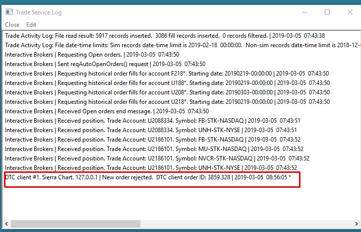Refer to the following: Using DTC Server for Data and Trading in Another Sierra Chart Instance: Using the Correct Trade Account (Rejections Related to Simulation Mode) You need to choose a simulated trading account on the Trade Window. Sierra Chart Support - Engineering Level Your definitive source for support. Other responses are from users. Try to keep your questions brief and to the point. Be aware of support policy: https://www.sierrachart.com/index.php?l=PostingInformation.php#GeneralInformation For the most reliable, advanced, and zero cost futures order routing, *change* to the Teton service: Sierra Chart Teton Futures Order Routing |