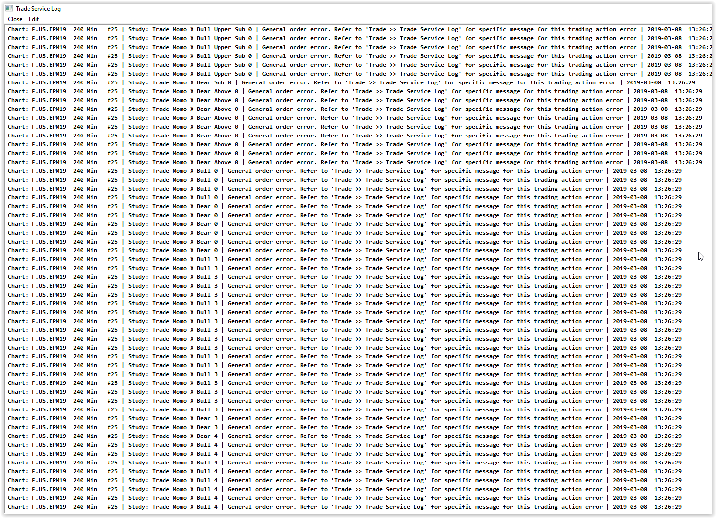 Hi, I am a new sierra user and have been trying diligently to troubleshoot this one, but with no luck yet. I have some custom studies on my chart. These studies draw things on my chart which I need, but it appears they also include some kind of ability to auto-trade. This ability is not active, as far as I understand, but I still get a constant and unending stream of notes like the following in my "Trade Service Log": Chart: F.US.EPM19 120 Min #24 | Study: Trade Momo X Bull 3 | General order error. Refer to 'Trade >> Trade Service Log' for specific message for this trading action error | 2019-03-08 09:51:37 Chart: F.US.EPM19 120 Min #24 | Study: Trade Momo X Bull 3 | General order error. Refer to 'Trade >> Trade Service Log' for specific message for this trading action error | 2019-03-08 09:51:37 Chart: F.US.EPM19 120 Min #24 | Study: Trade Momo X Bull 3 | General order error. Refer to 'Trade >> Trade Service Log' for specific message for this trading action error | 2019-03-08 09:51:37 Chart: F.US.EPM19 120 Min #24 | Study: Trade Momo X Bull 3 | General order error. Refer to 'Trade >> Trade Service Log' for specific message for this trading action error | 2019-03-08 09:51:37 Chart: F.US.EPM19 120 Min #24 | Study: Trade Momo X Bear 3 | General order error. Refer to 'Trade >> Trade Service Log' for specific message for this trading action error | 2019-03-08 09:51:37 Chart: F.US.EPM19 120 Min #24 | Study: Trade Momo X Bear 3 | General order error. Refer to 'Trade >> Trade Service Log' for specific message for this trading action error | 2019-03-08 09:51:37 Chart: F.US.EPM19 120 Min #24 | Study: Trade Momo X Bear 3 | General order error. Refer to 'Trade >> Trade Service Log' for specific message for this trading action error | 2019-03-08 09:51:37 Chart: F.US.EPM19 120 Min #24 | Study: Trade Momo X Bear 3 | General order error. Refer to 'Trade >> Trade Service Log' for specific message for this trading action error | 2019-03-08 09:51:37 Chart: F.US.EPM19 120 Min #24 | Study: Trade Momo X Bear 3 | General order error. Refer to 'Trade >> Trade Service Log' for specific message for this trading action error | 2019-03-08 09:51:37 Chart: F.US.EPM19 120 Min #24 | Study: Trade Momo X Bear 3 | General order error. Refer to 'Trade >> Trade Service Log' for specific message for this trading action error | 2019-03-08 09:51:37 Chart: F.US.EPM19 120 Min #24 | Study: Trade Momo X Bear 3 | General order error. Refer to 'Trade >> Trade Service Log' for specific message for this trading action error | 2019-03-08 09:51:37 Chart: F.US.EPM19 120 Min #24 | Study: Trade Momo X Bear 3 | General order error. Refer to 'Trade >> Trade Service Log' for specific message for this trading action error | 2019-03-08 09:51:37 Chart: F.US.EPM19 120 Min #24 | Study: Trade Momo X Bear 3 | General order error. Refer to 'Trade >> Trade Service Log' for specific message for this trading action error | 2019-03-08 09:51:37 Chart: F.US.EPM19 120 Min #24 | Study: Trade Momo X Bear 3 | General order error. Refer to 'Trade >> Trade Service Log' for specific message for this trading action error | 2019-03-08 09:51:37 Chart: F.US.EPM19 120 Min #24 | Study: Trade Momo X Bear 4 | General order error. Refer to 'Trade >> Trade Service Log' for specific message for this trading action error | 2019-03-08 09:51:37 Chart: F.US.EPM19 120 Min #24 | Study: Trade Momo X Bear 4 | General order error. Refer to 'Trade >> Trade Service Log' for specific message for this trading action error | 2019-03-08 09:51:37 Chart: F.US.EPM19 120 Min #24 | Study: Trade Momo X Bear 4 | General order error. Refer to 'Trade >> Trade Service Log' for specific message for this trading action error | 2019-03-08 09:51:37 Chart: F.US.EPM19 120 Min #24 | Study: Trade Momo X Bull 4 | General order error. Refer to 'Trade >> Trade Service Log' for specific message for this trading action error | 2019-03-08 09:51:37 Chart: F.US.EPM19 120 Min #24 | Study: Trade Momo X Bull 4 | General order error. Refer to 'Trade >> Trade Service Log' for specific message for this trading action error | 2019-03-08 09:51:37 Chart: F.US.EPM19 120 Min #24 | Study: Trade Momo X Bull 4 | General order error. Refer to 'Trade >> Trade Service Log' for specific message for this trading action error | 2019-03-08 09:51:37 Chart: F.US.EPM19 120 Min #24 | Study: Trade Momo X Bull 4 | General order error. Refer to 'Trade >> Trade Service Log' for specific message for this trading action error | 2019-03-08 09:51:37 Chart: F.US.EPM19 5 Min #7 | Study: Trade BBs Above Top Band | General order error. Refer to 'Trade >> Trade Service Log' for specific message for this trading action error | 2019-03-08 09:51:37 Chart: F.US.EPM19 5 Min #7 | Study: Trade BBs Above Top Band | General order error. Refer to 'Trade >> Trade Service Log' for specific message for this trading action error | 2019-03-08 09:51:37 Chart: F.US.EPM19 5 Min #7 | Study: Trade BBs Above Top Band | General order error. Refer to 'Trade >> Trade Service Log' for specific message for this trading action error | 2019-03-08 09:51:37 Chart: F.US.EPM19 5 Min #7 | Study: Trade BBs Above Top Band | General order error. Refer to 'Trade >> Trade Service Log' for specific message for this trading action error | 2019-03-08 09:51:37 Chart: F.US.EPM19 5 Min #7 | Study: Trade BBs Above Top Band | General order error. Refer to 'Trade >> Trade Service Log' for specific message for this trading action error | 2019-03-08 09:51:37 Chart: F.US.EPM19 5 Min #7 | Study: Trade BBs Above Top Band | General order error. Refer to 'Trade >> Trade Service Log' for specific message for this trading action error | 2019-03-08 09:51:37 Chart: F.US.EPM19 5 Min #7 | Study: Trade BBs Above Top Band | General order error. Refer to 'Trade >> Trade Service Log' for specific message for this trading action error | 2019-03-08 09:51:37 Chart: F.US.EPM19 5 Min #7 | Study: Trade BBs Above Top Band | General order error. Refer to 'Trade >> Trade Service Log' for specific message for this trading 