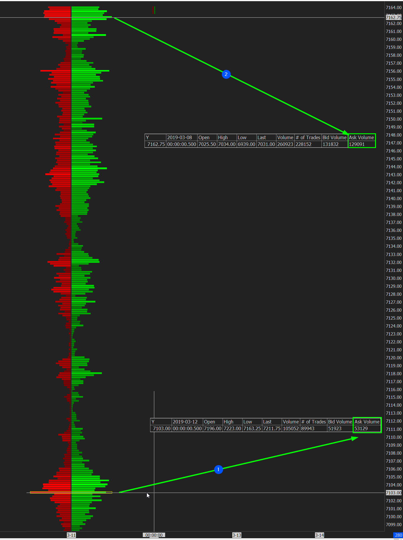 Is there a way to highlight the highest traded BID and ASK volume at price? I've tryed with number bars' split profile, but I can highlight only the highest traded volume at price (vPOC) without the option to separate the BID and the ASK vPOC. If you take a look at the pitcure below, you can see that the vPOC is highlighted at 1, what I need is to highlight the volume at 2 (look at the Compact Tool Values Window) Thank You |