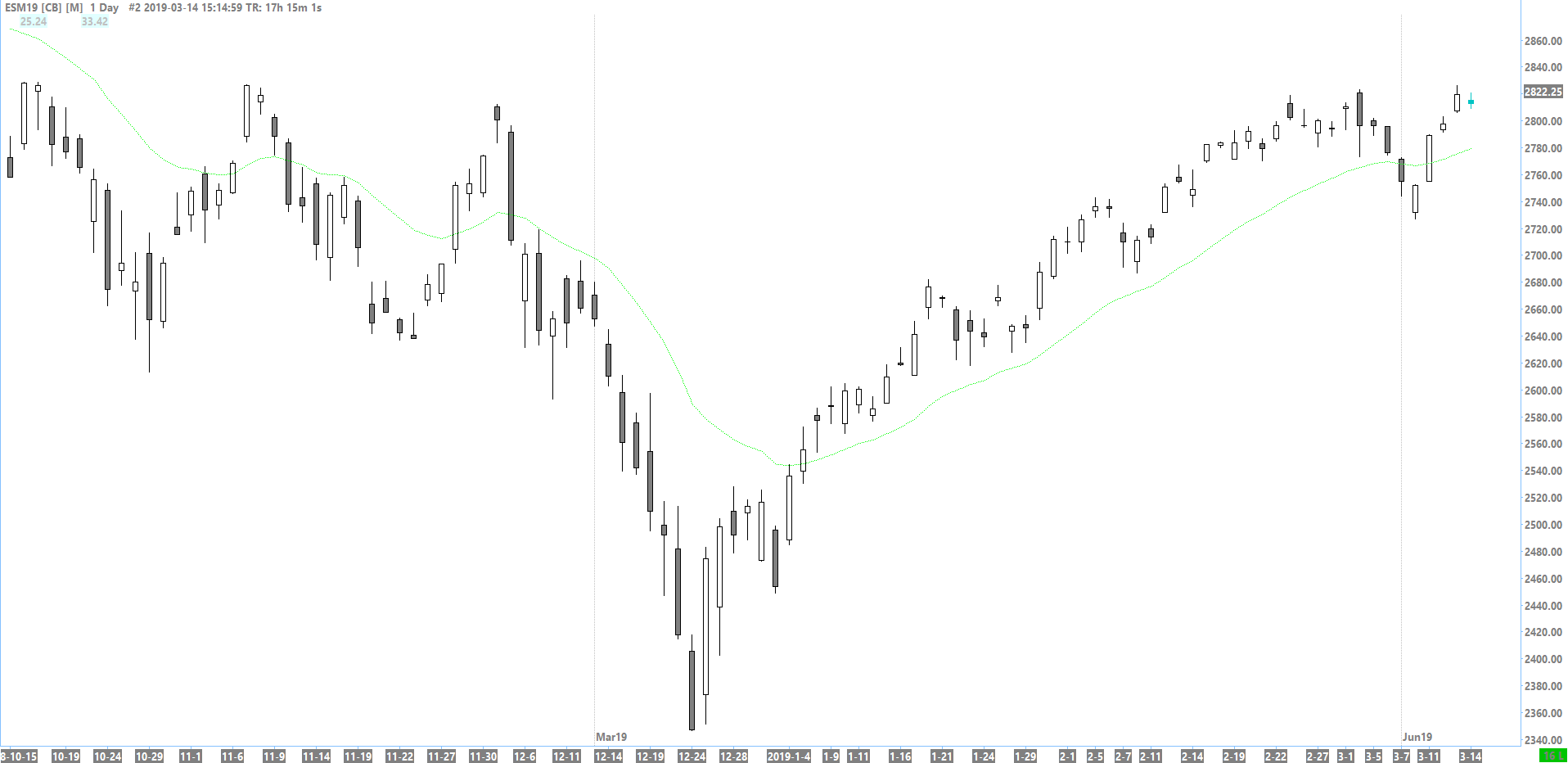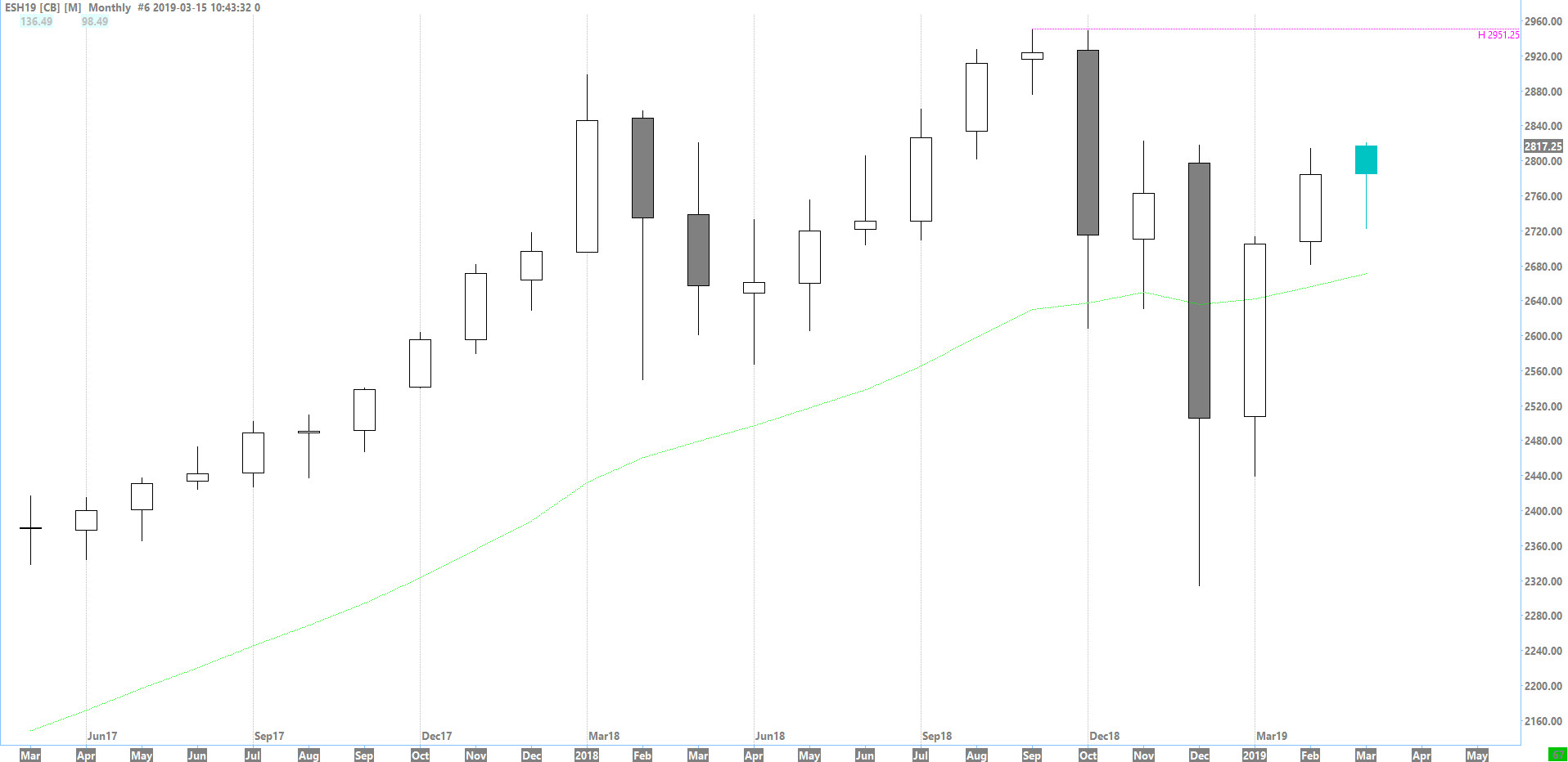 To solve the problem the Monthly chart needs to be changed also to ESM19. This is critical since back adjustments are being done. It is set to the March contract.