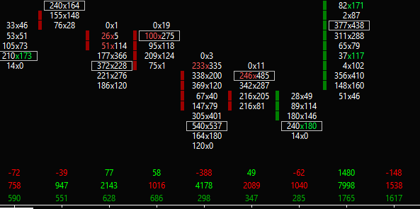 Hi At the bottom of the foot print chart are 3 sets of numbers creating Delta. We understand why the the top set and bottom sets of numbers are green and red. What we want to understand is what is the middle calculation for turning the number such as 758 on the left hand side Red? why is the next number 947 Green, 2143 green, why? We understand that the middle number in red at 758 is calculated by counting all the numbers inside that candle. Thanks Will |