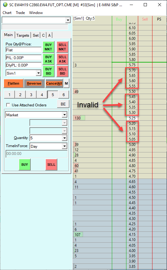 Using SC Futures SC Order Routing The Trading DOM when viewing an ES Futures option is using .05 above $5 which I think needs to be .25. I am looking at EW4H19 C2860.EW4.FUT_OPT.CME. Is there a way for me to correct the scale above the $5 price? CME spec https://www.cmegroup.com/trading/equity-index/us-index/e-mini-sandp500_contractSpecs_options.html?optionProductId=5222#optionProductId=5222 |