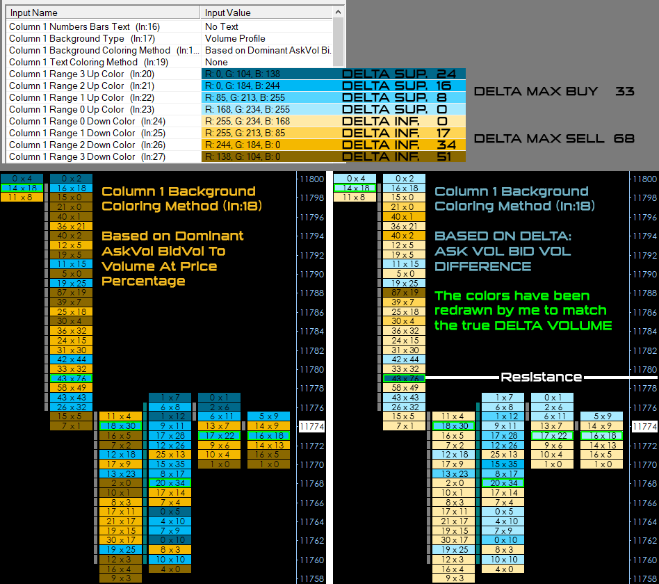 It would be perfect to add in the NUMBER BAR, the ability to display the color according to the delta volume, not in percentage, but compared to the largest number of a candle price? I have attached an explanatory image. Option 1: The client defines the value of each delta relative to a color. Exemple: Color of a positive delta: Color 1 greater than "0" Color 2 greater than "30" Color 3 greater than "60" Color 4 greater than "90" Color of a negative delta: Color 1 less than "0" Color 2 less than "30" Color 3 less than "60" Color 4 less than "90" Option 2: The color is automatically calculated between 0 and the delta maximum volume of each tick relative to the candlestick or in relation to the daily session. Thank you in advance for all the work you have done so far. Dorian Date Time Of Last Edit: 2019-03-20 13:31:30