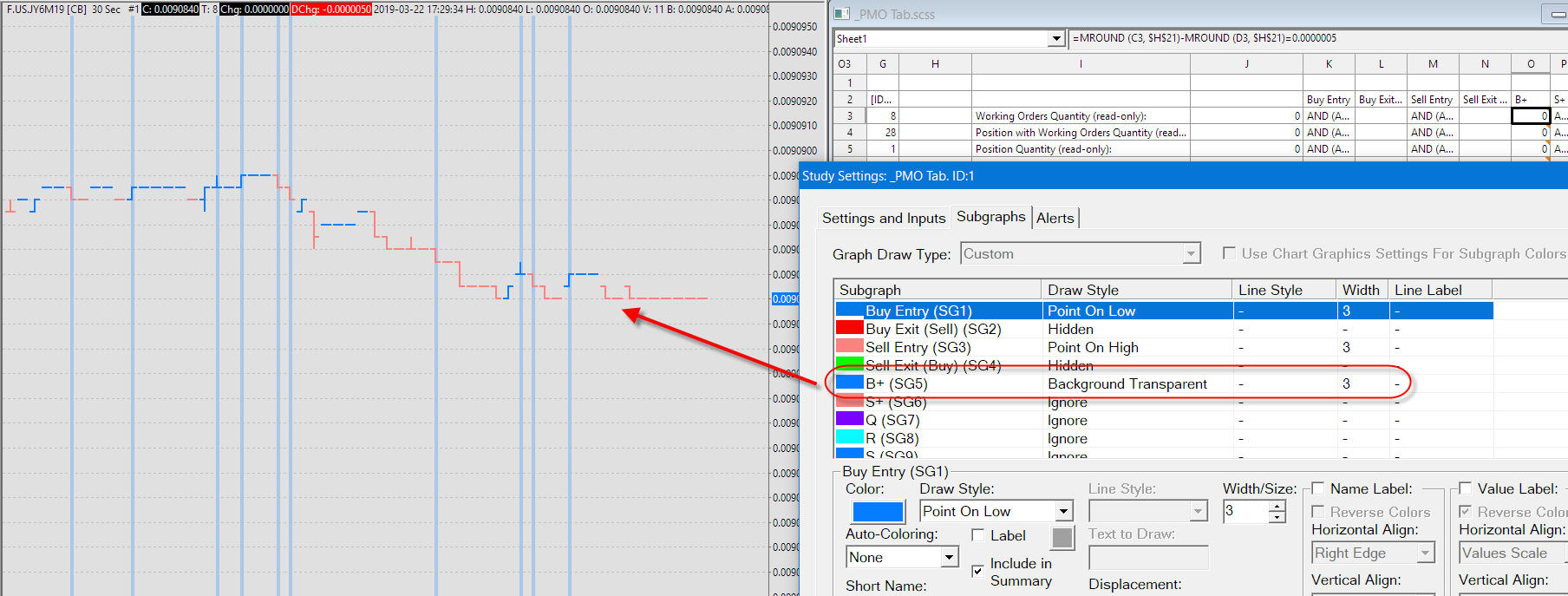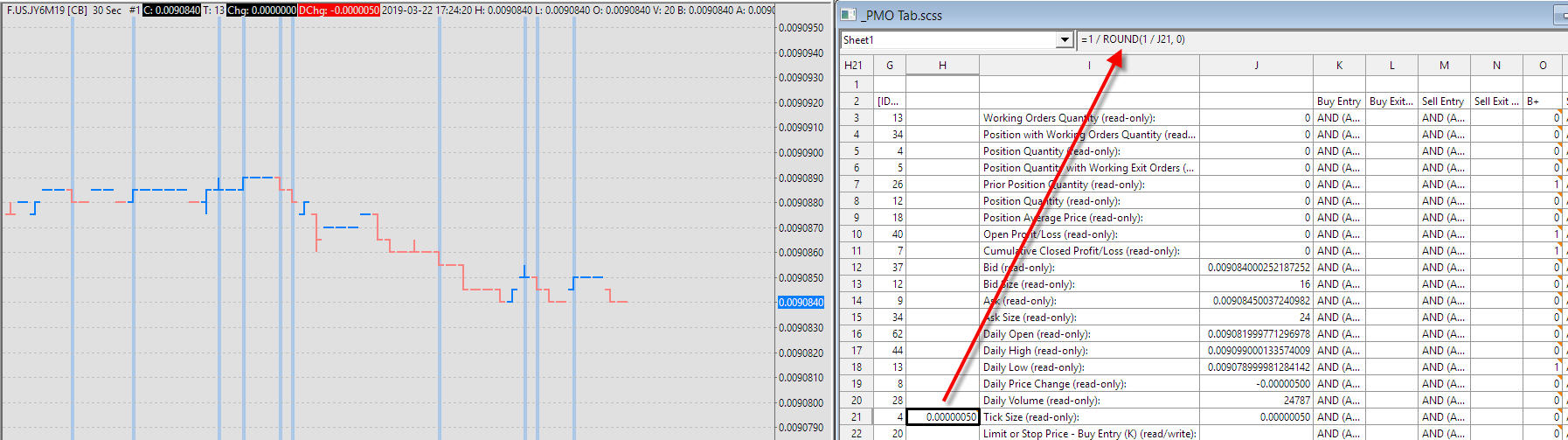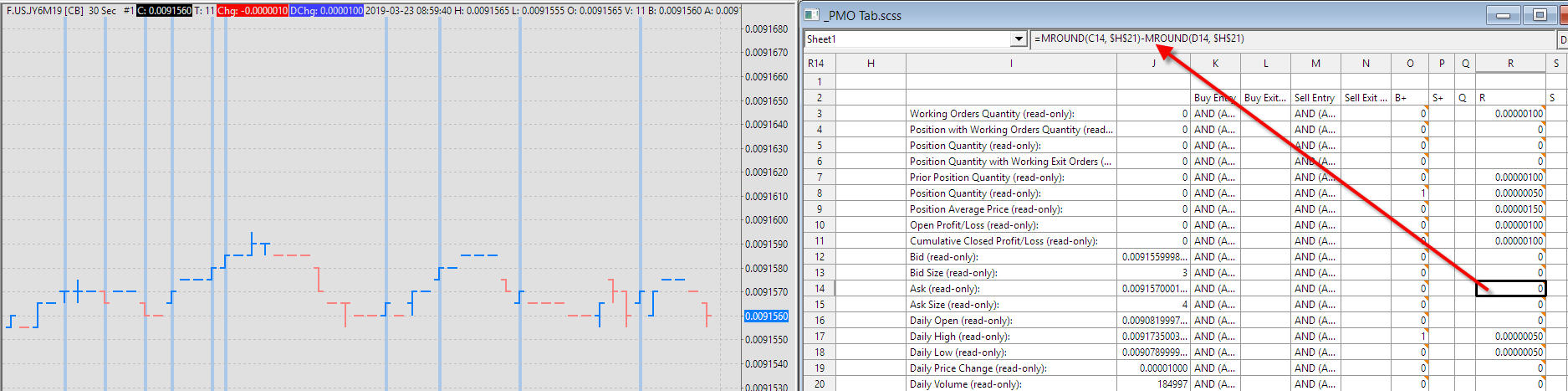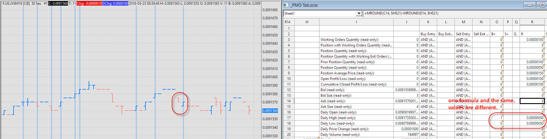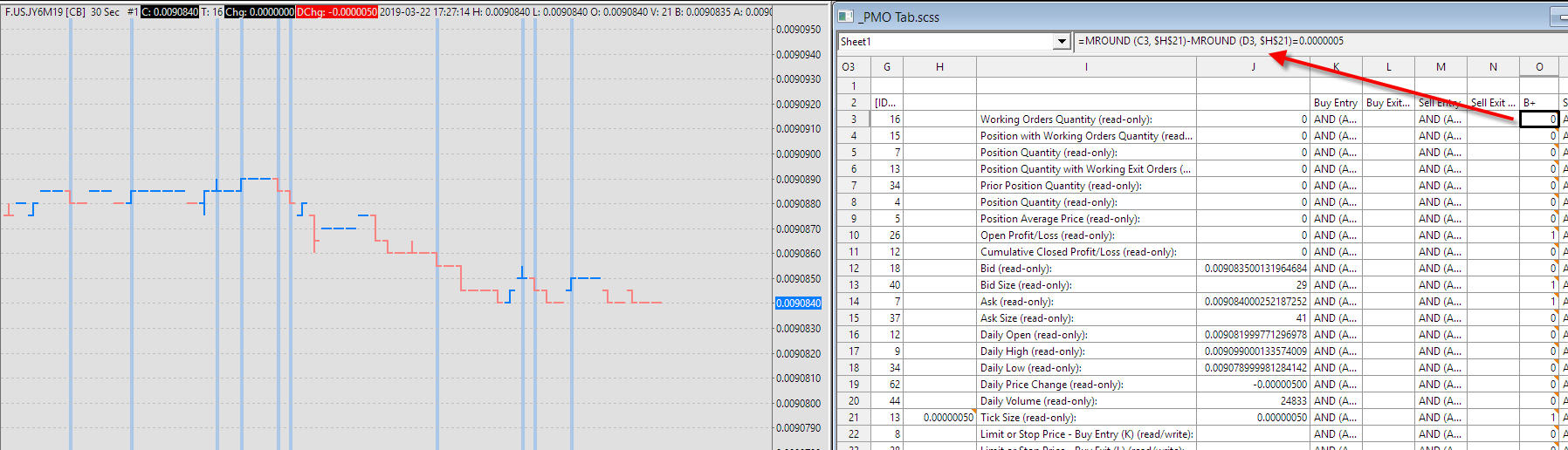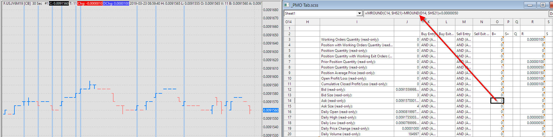 You need to change the formula that currently reads MROUND(C14, $H$21) - MROUND(D14, $H$21) = 0.00000050 to state something like the following (you will need to determine the appropriate value to be used): ABS(C14 - D14) < 0.0000001 Needing to do this is described in the documentation here: Using the Spreadsheet Study: Imprecision of Floating-Point Numbers and Comparisons For the most reliable, advanced, and zero cost futures order routing, use the Teton service: Sierra Chart Teton Futures Order Routing |