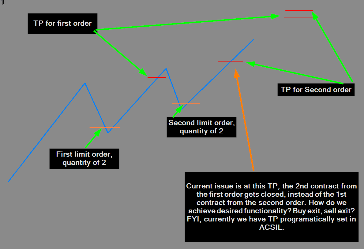 Hello! Currently having a small issue with our TP management in acsil, clearly the mistake is on our end, hoping someone can shed light on a solution that has eluded us. Attached image explains the issue much more concisely than words, please have a look. Essentially, the situation is that our TP's are closing the incorrect parent orders. Please note, we are not using buyexit or sellexit order actions, but rather setting fixed targets when declaring our s_SCNewOrder object. Any hints are appreciated. Thanks! |