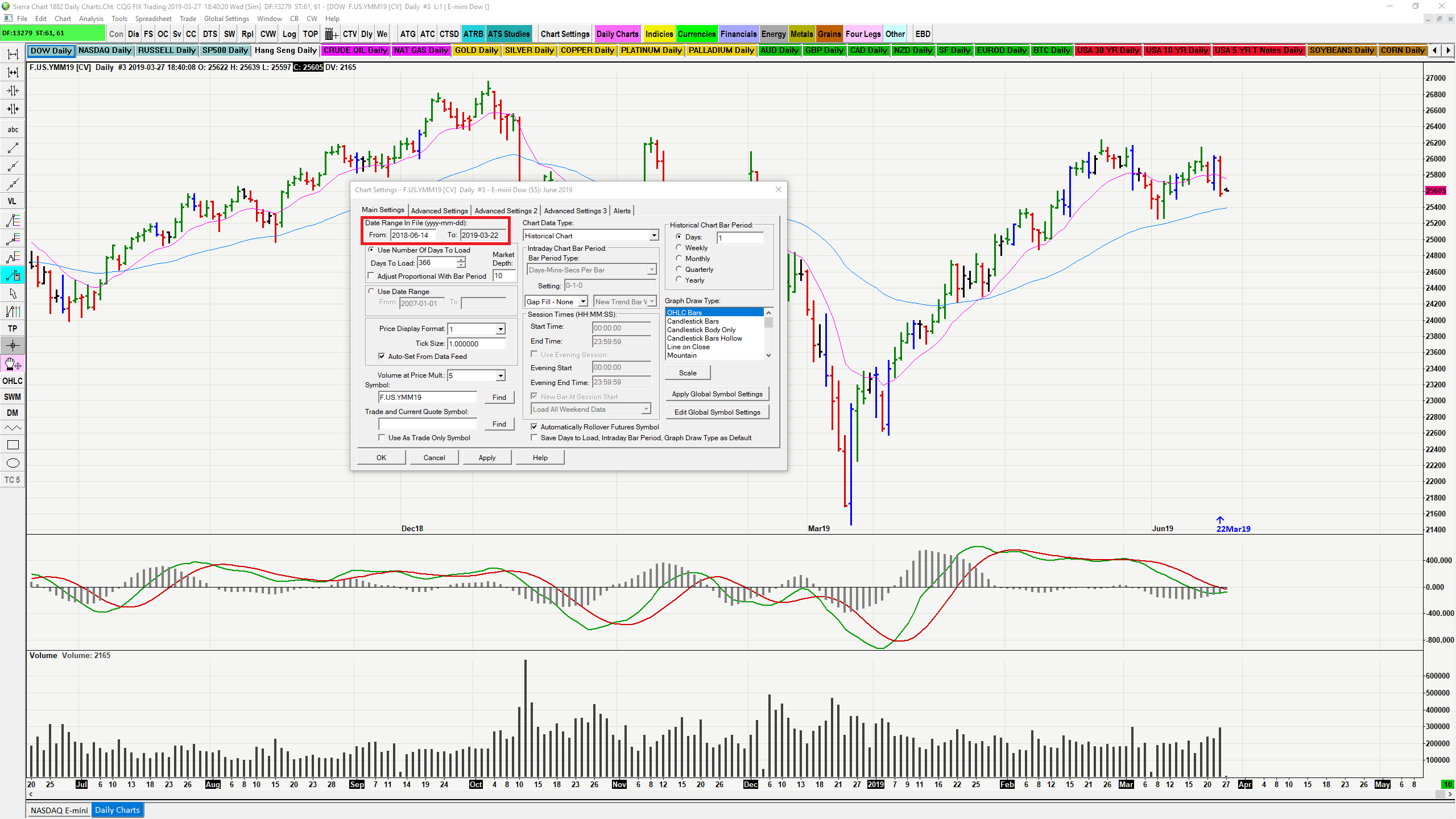 here is a screen shot of my Sierra. The Chart is F.US.YMM19 Mini Dow. The data stops at 3/22/19 as does the data in ALL the charts listed with the coloured tabs. Intraday data is updating with the latest data no problems. You will see the greyed out To Date is set at 2019-03-22. This field cannot be changed as far as I have been able to determine. I have tried refreshing the chart. Loading a new chart. Deleting the data files and updating. Nothing so far has solved the problem. |