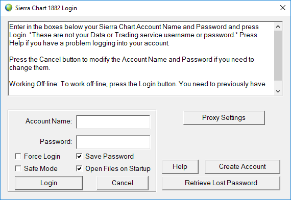 Regrading the login issue, refer to the HTTP Communication Errors page: HTTP Communication Errors The most likely issue, is that you have a firewall on your system that is blocking Sierra Chart. Sierra Chart Support |