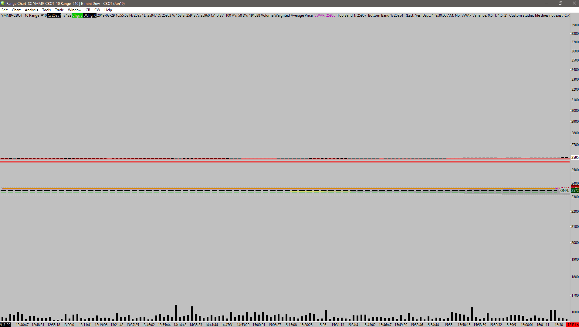Move the Volume study in that chart to Chart Region 2. Also if you still have a problem temporarily Hide the other studies until you see which one is causing the problem. Sierra Chart Support - Engineering Level Your definitive source for support. Other responses are from users. Try to keep your questions brief and to the point. Be aware of support policy: https://www.sierrachart.com/index.php?l=PostingInformation.php#GeneralInformation For the most reliable, advanced, and zero cost futures order routing, *change* to the Teton service: Sierra Chart Teton Futures Order Routing |