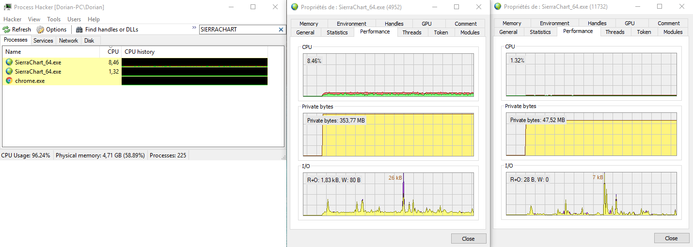 I wanted to see what Sierra Chart only uses in real time, and it works. Thank you :) For an 8-core processor, 100% / 8 = 12.5 Sierra Chart should not exceed 12.5% of use. It happened to me to go up to 16% sometimes. So I did: File: New Instance and I opened the DOM. I went from 5 frames / second to 40 frames / second. Sierra Chart: 8% Sierra Chart Instance (with DOM): 1% Date Time Of Last Edit: 2019-04-04 10:43:05