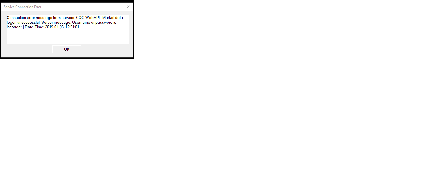 this is the msg im getting what do i do? connection error message from service CQG Web=API Market data logon unsuccessful. Server message. Username or password is incorrect