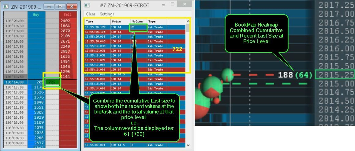 @Sierra Chart Engineering, I would like to make an update to the previous request. I would like to request that you either update or provide a separate option to display both the accumulated last size at the bid/ask and the accumulated last size at the current price level, separated by a delimiter i.e. slash, dash or parentheses. I know that Bookmap has this feature available in their heatmap. Please see the attached image as example of what I am requesting in comparison to what is available in Bookmap. Thank You |