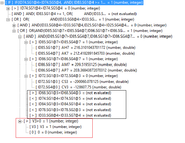 Right, but for example, in the code corresponding to the detail analysis image: OR( AND(ID33.SG8@4>ID33.SG7@4,ID25.SG1@4>ID25.SG4@4,ID68.SG1@4>ID68.SG4@4,ID51.SG1@4>ID51.SG4@4,ID51.SG1@5>ID51.SG4@5,ID51.SG1@6>ID51.SG4@6,ID72.SG1@4>ID72.SG4@4,ID74.SG1@4<ID74.SG1@5,ID84.SG1@4<ID84.SG1@5),OR( AND(ID85.SG1@7>ID85.SG4@7,ID86.SG1@7>ID86.SG4@7,ID33.SG8@4>ID33.SG7@4,ID72.SG1@3>ID72.SG4@3,ID68.SG1@3>ID68.SG4@3,ID74.SG1@4<ID74.SG1@5,ID84.SG1@3<ID84.SG1@4,ID78.SG1@3<ID78.SG2@3) ,V3>0) ) In my case above, it seems that when the first and second "AND()" clauses went false, V3 still came up with a TRUE reading somehow(?) I don't see where/why V3 became true tbh.. Is it possible that the spreadsheet program is carrying over the "previous V3's" TRUE via some strange delay? |