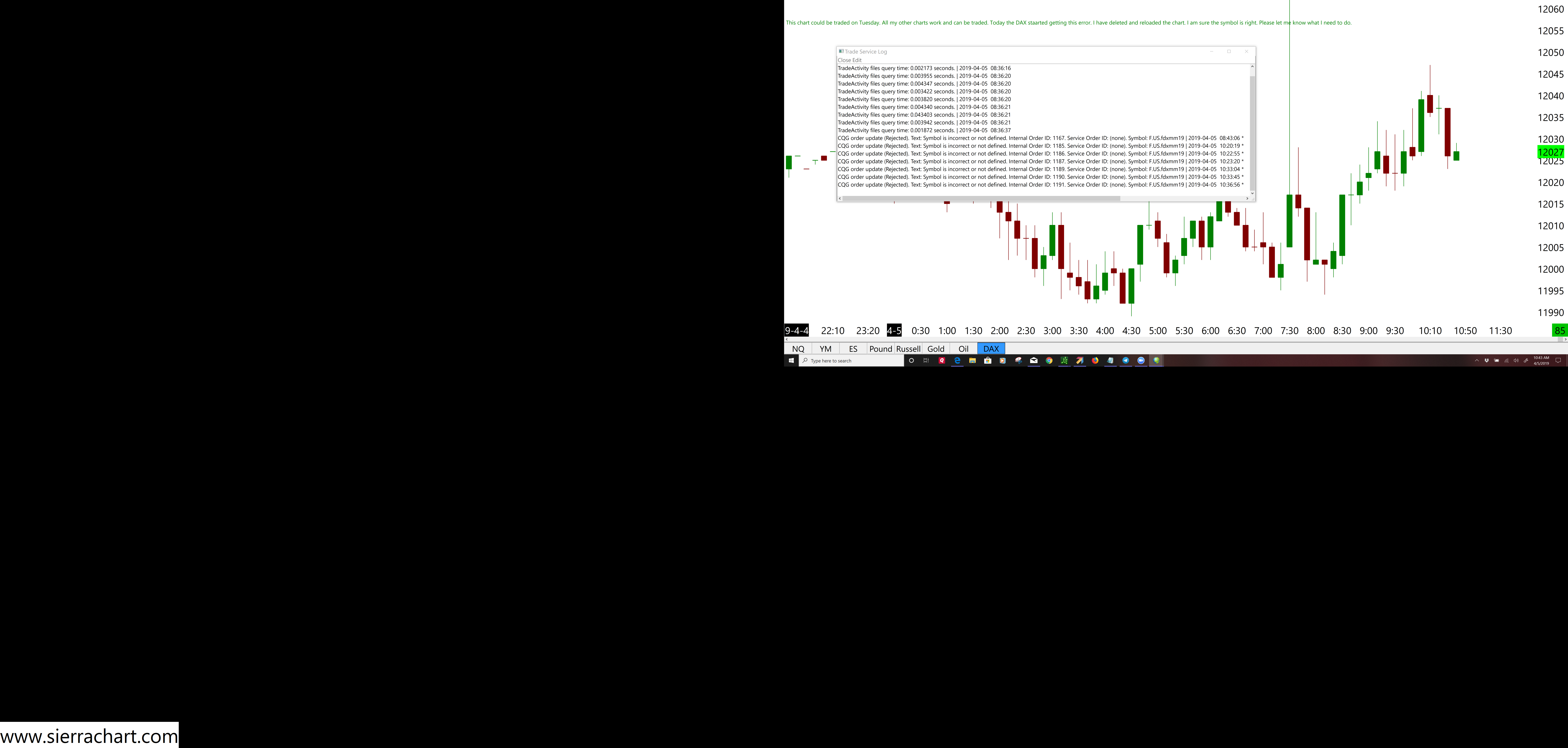 http://www.sierrachart.com/image.php?Image=1554478988899.png I can't trade on the DAX Chart. My friend has the Sierra Chart and the same broker and Data plan. His DAX chart works. All my other charts are working and trading fine. Ron Date Time Of Last Edit: 2019-04-05 17:15:28